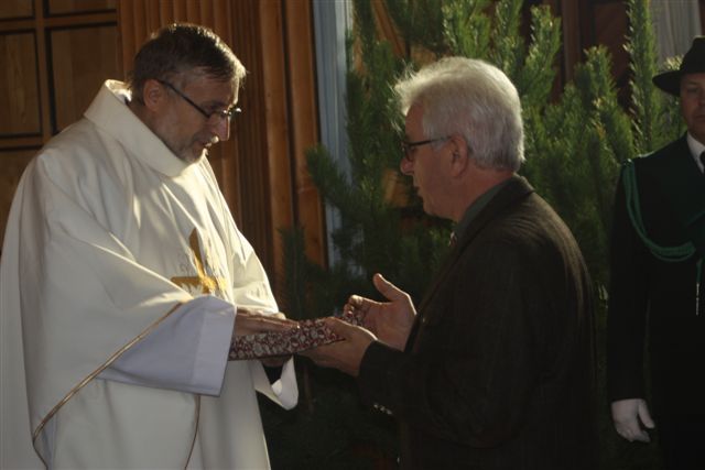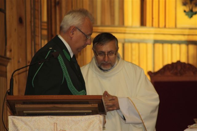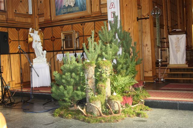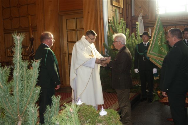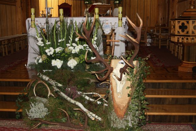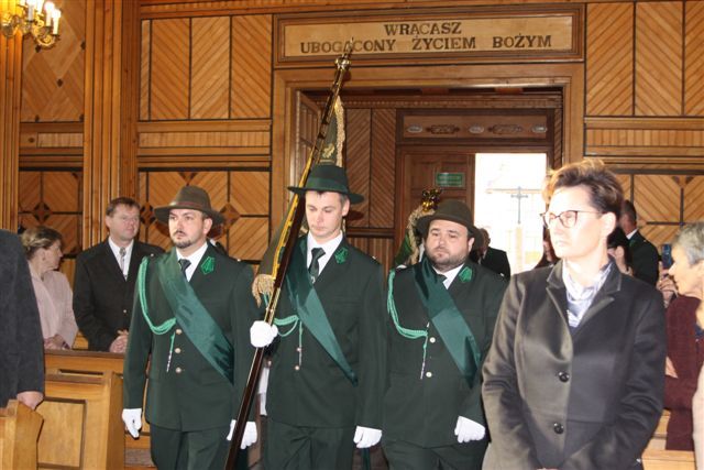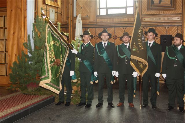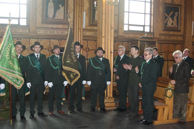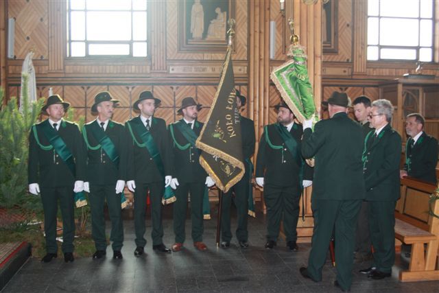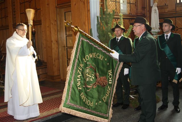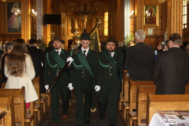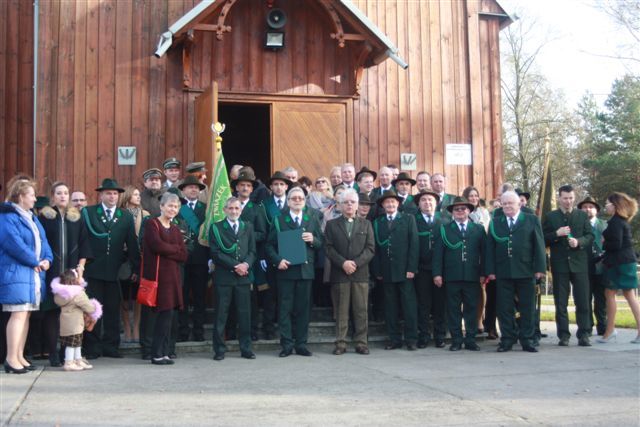 Niezwykła architektura drewnianego kościoła i otoczenie lasów pięknie współgrało z nadaniem i poświęceniem sztandaru Kołu Łowieckiemu "KOS", które odbyło się 26 października 2019 r.